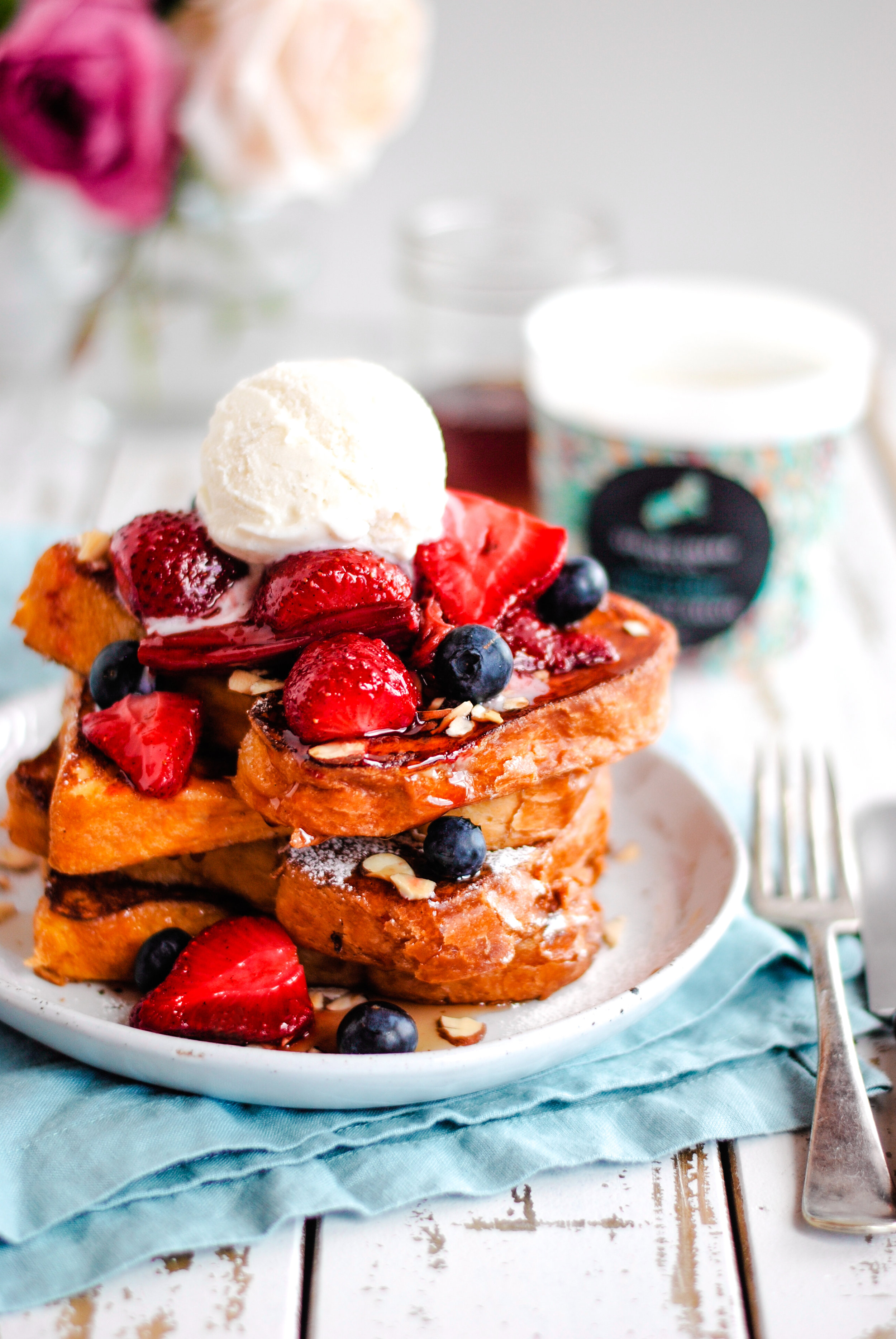I've collaborated with Spring Sheep Milk Co. to produce this yummy summer brunch recipe. Last week they kindly sent me some of their delicious Dark Chocolate and Vanilla Bean Gelato to try. I'd never tasted sheep's milk ice cream before and was blown away by how smooth and creamy it was. The vanilla bean was so luscious and intensely flavoured. I couldn't think of anything better than to serve it with almond crusted brioche french toast and season baked fruit.
