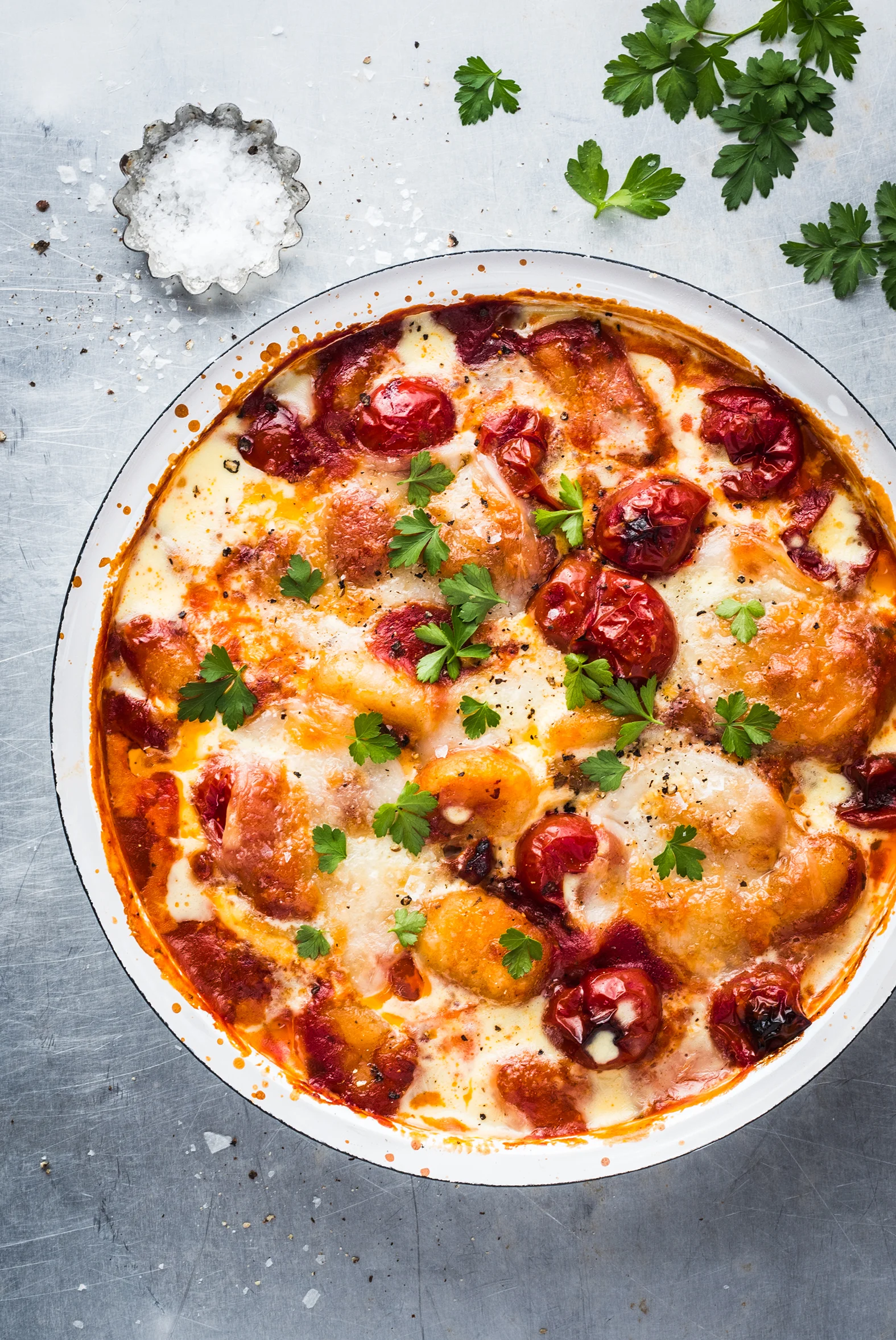 Baked gnocchi in a rich and spicy chorizo and cherry tomato sauce. Topped with cream, mozzarella and fresh parsley. This dish is great served with a rocket salad. Tinned cherry tomatoes are a available at most large supermarkets.