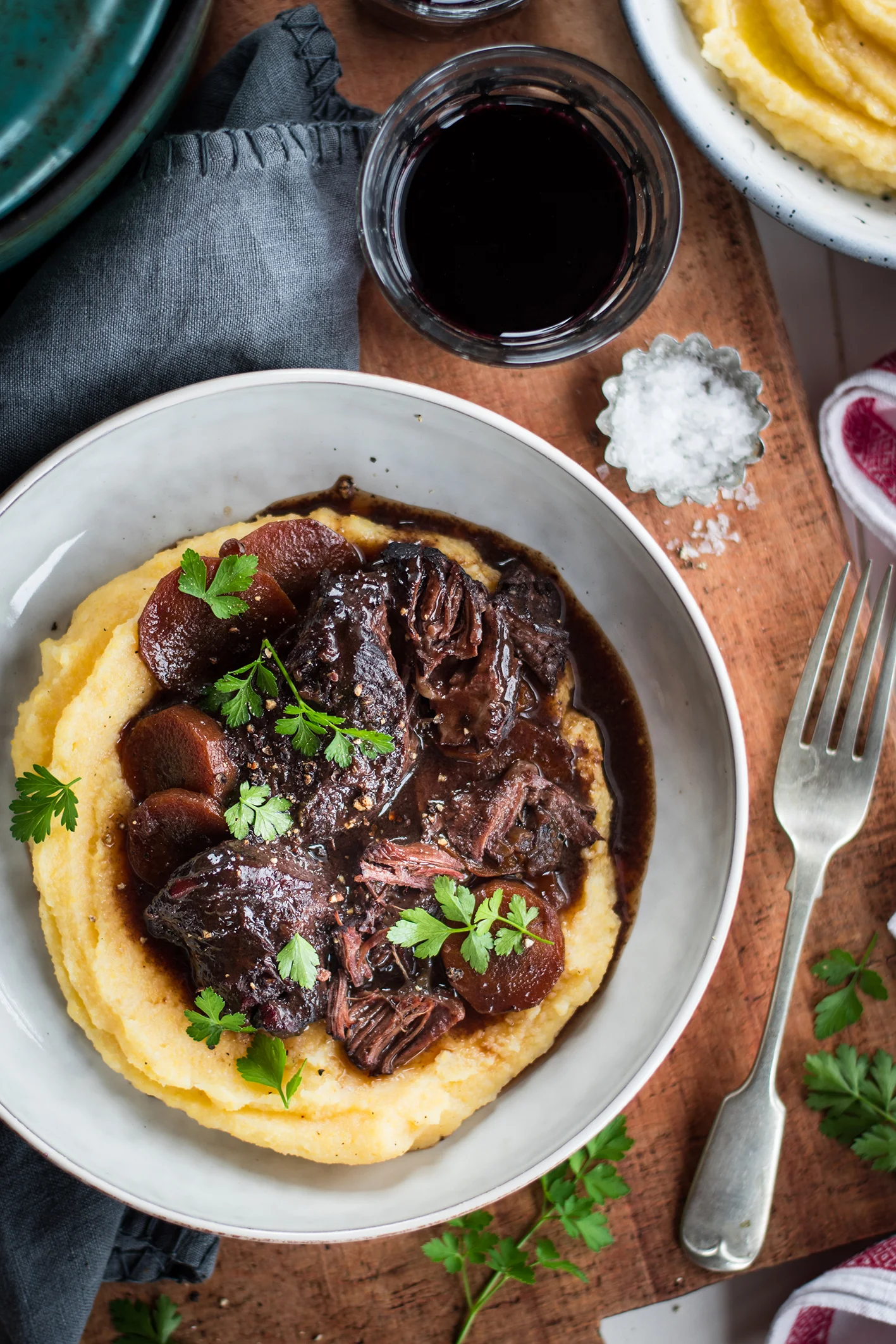 A great dish for a cold winters night. The beef cheeks are slow cooked in a rich red wine sauce until tender and falling apart. Served with creamy parmesan polenta and a glass of red wine!