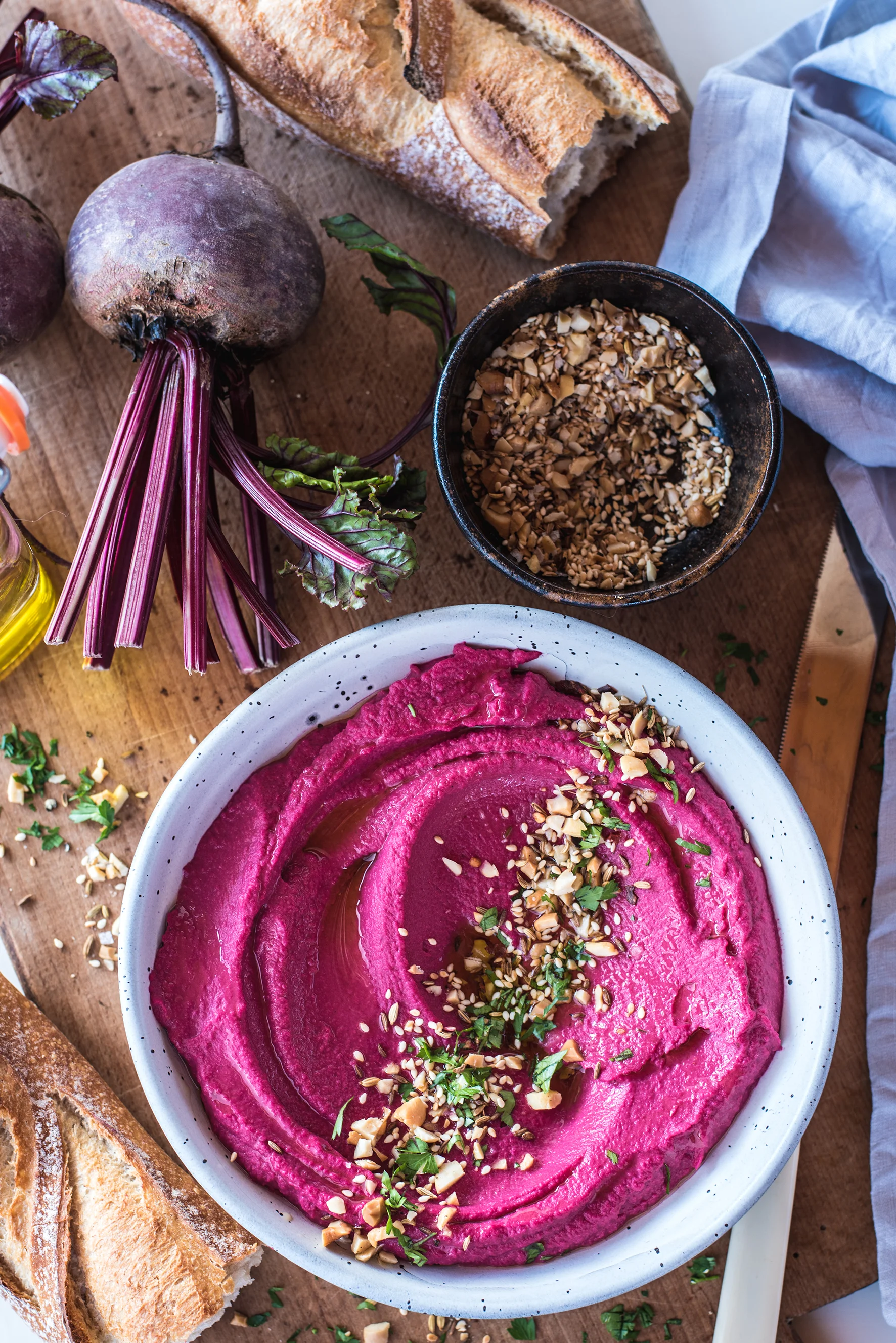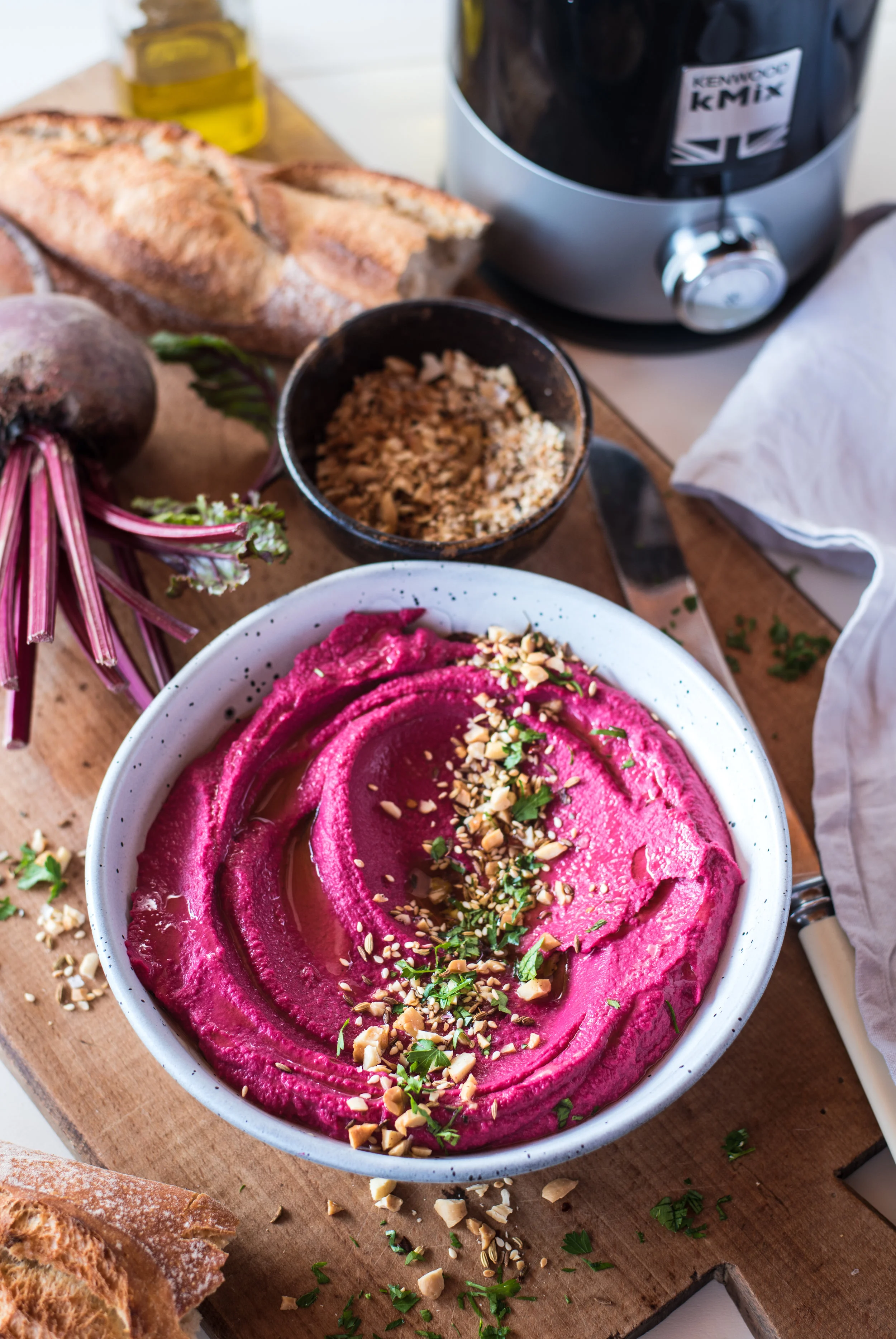 Earthy and sweet beetroot hummus served with an aromatic cashew nut dukkah and crusty fresh bread. This hummus is great for entertaining, not just for the taste but also its vibrant colour!