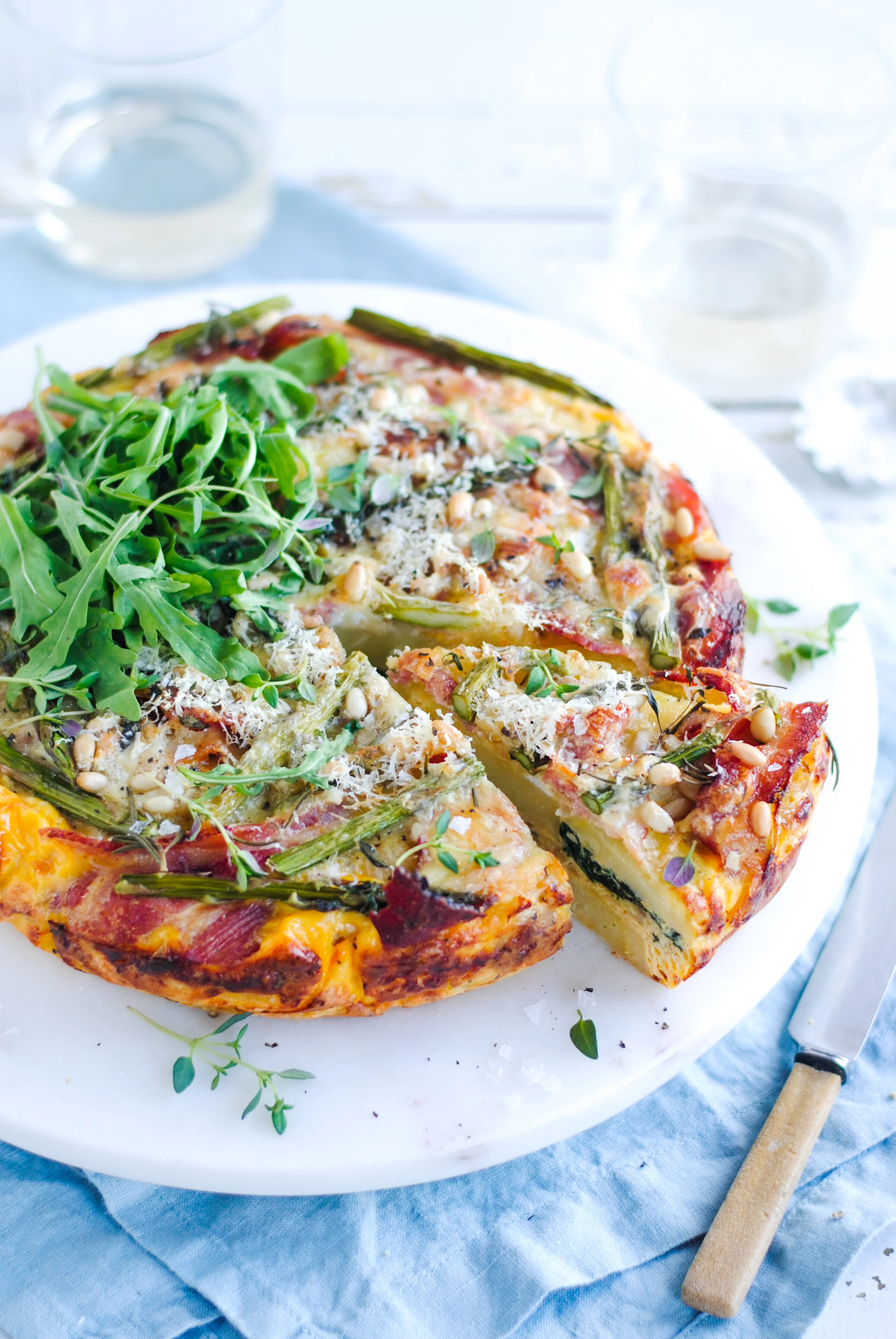 An easy but incredibly tasty frittata with caramelised leeks, Agria potatoes, smokey bacon, asparagus and three kinds of cheese! Great for summer picnics.