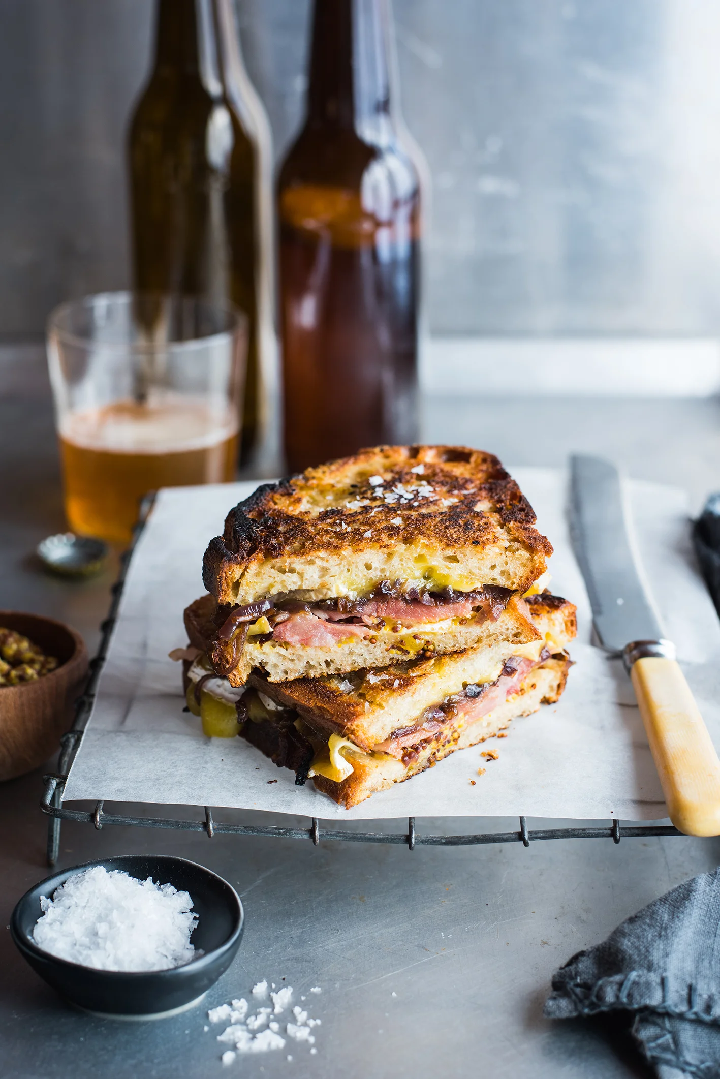Place 4 pieces of sourdough on a chopping board, smear each piece with wholegrain mustard. Top with a piece of camembert, a slice of ham, caramelised onions and another slice of camembert. Finish with another piece of sourdough.