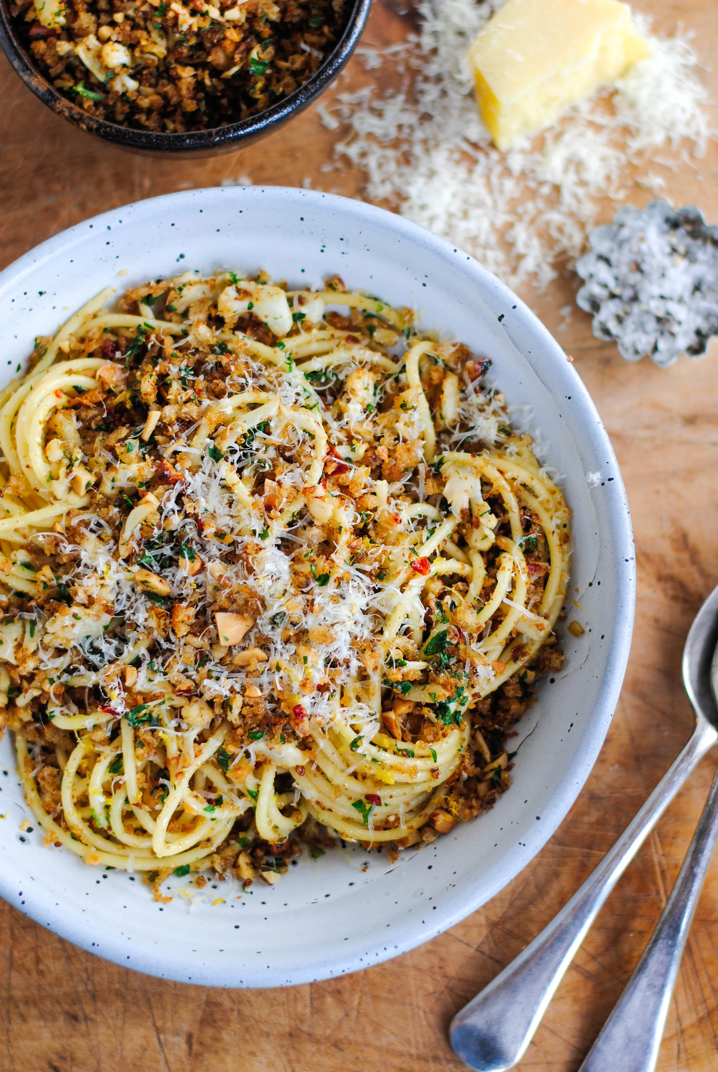 Crunchy sourdough breadcrumbs, cauliflower and garlic are fried with chilli, lemon, parsley and roasted almonds and tossed through spaghetti and olive oil. A really quick and easy meal to throw together on a weeknight.