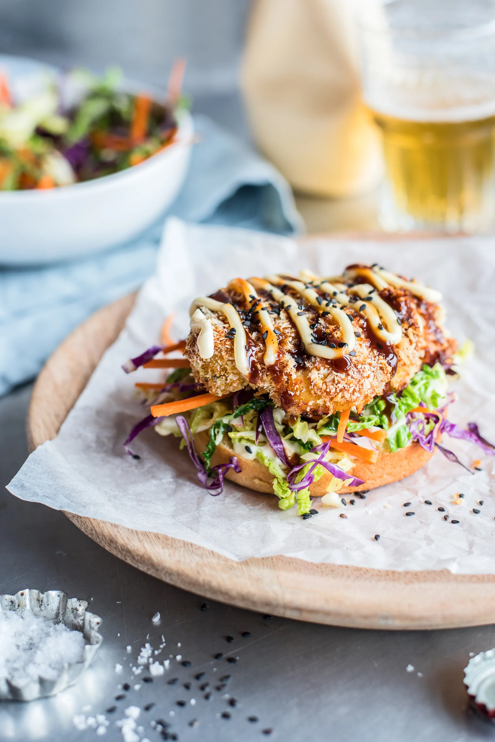 Crispy baked panko chicken with Japanese mayonnaise, Tonkatsu sauce and a crunchy sesame slaw.