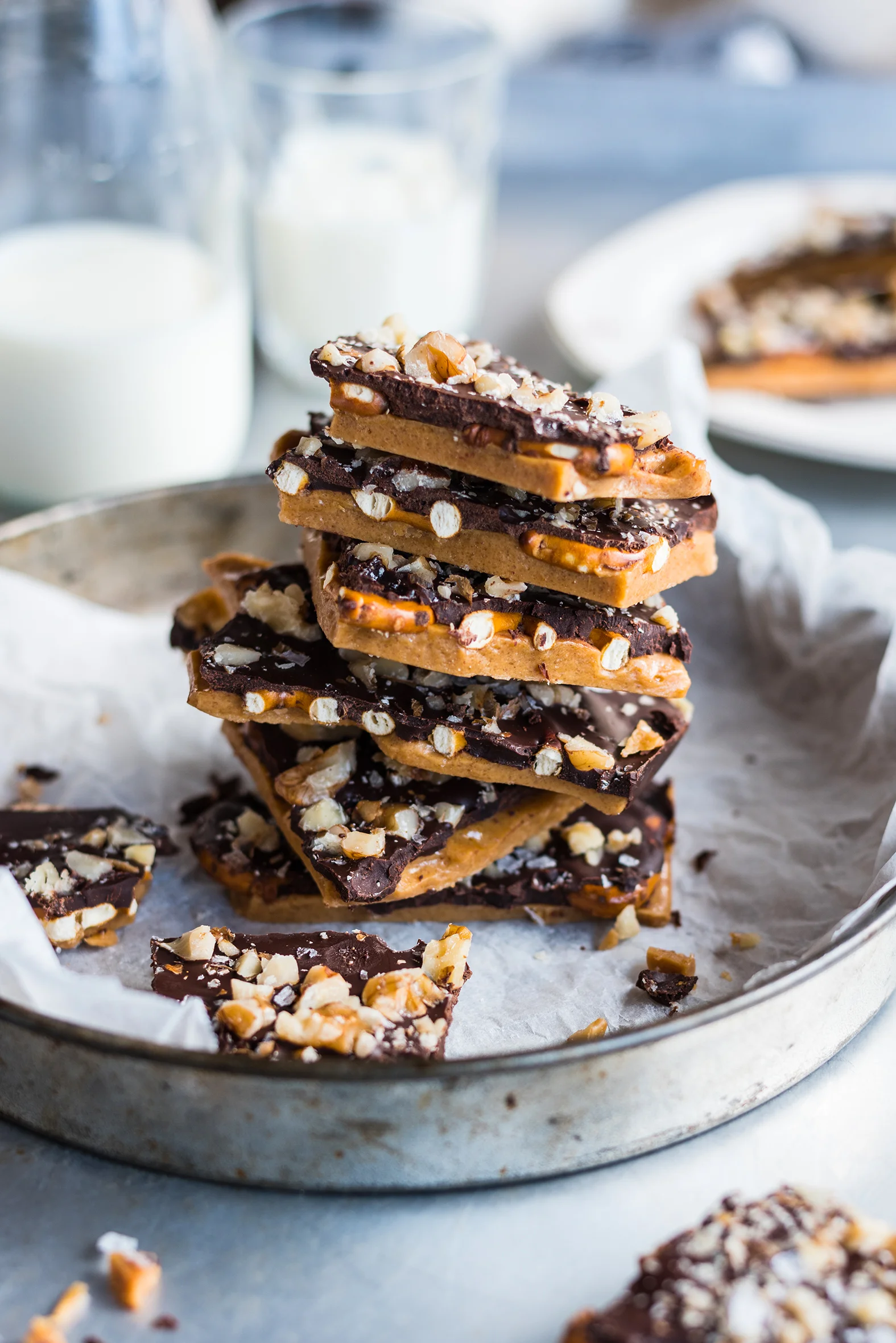 Rich buttery toffee topped with pretzels, dark chocolate, walnuts and sea salt. This recipe is so quick and easy and always impresses a crowd.