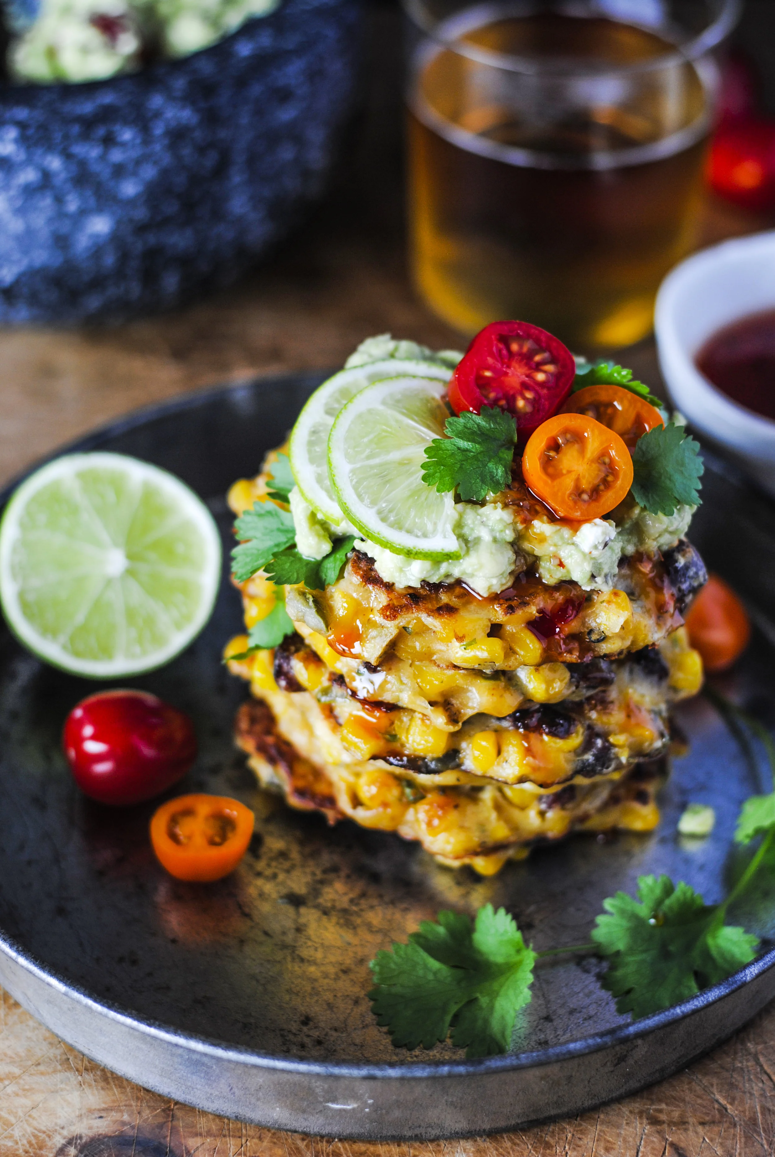 Serve fritters stacked with a large spoonful of guacamole, cherry tomatoes, lime wedges, extra sweet chilli and a green salad.