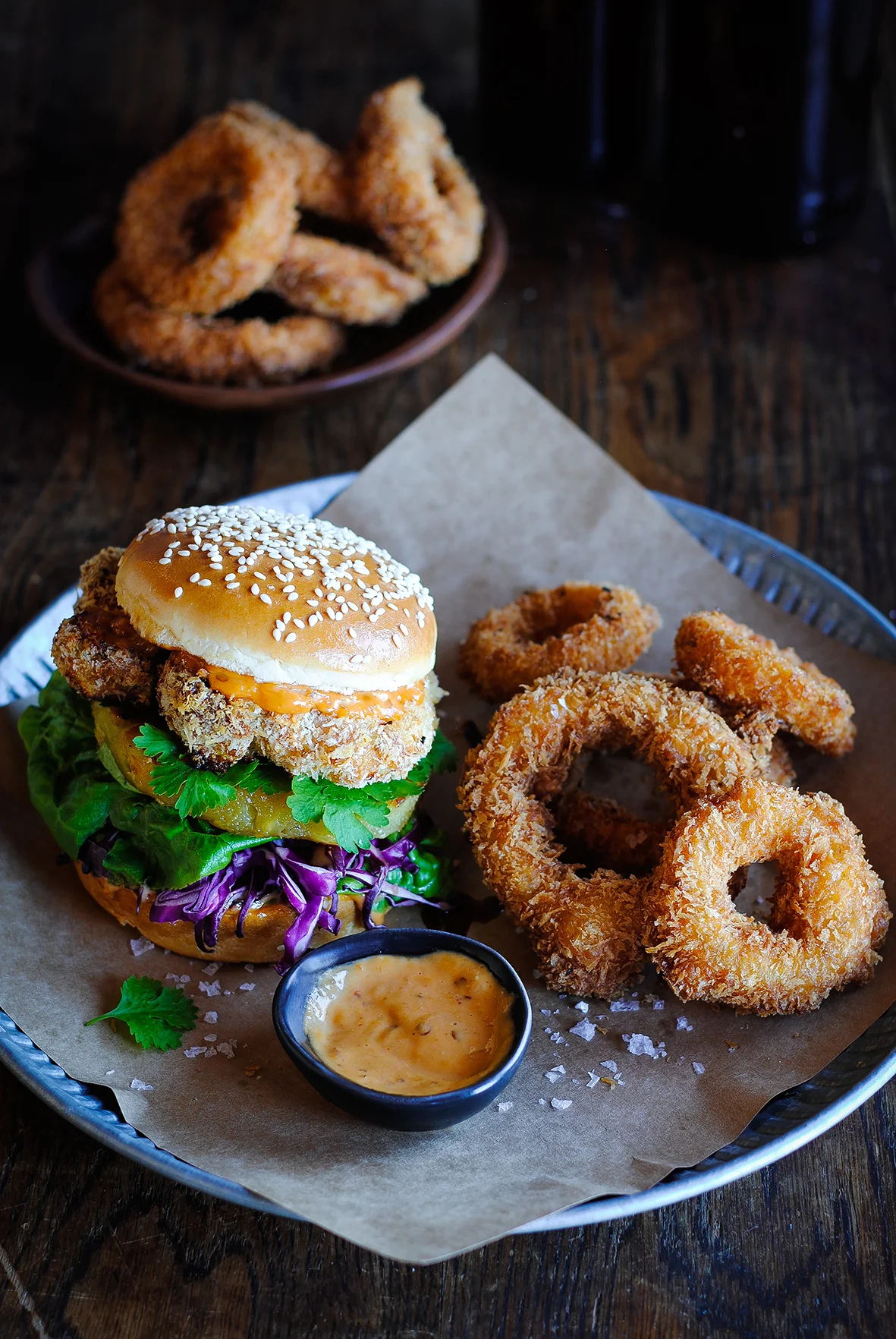 These burgers are crazy good! Crunchy crumbed chicken, grilled pineapple, coriander, chipotle mayo and salad are sandwiched between soft brioche buns and served with panko crumbed onion rings. Great for a weekend treat.