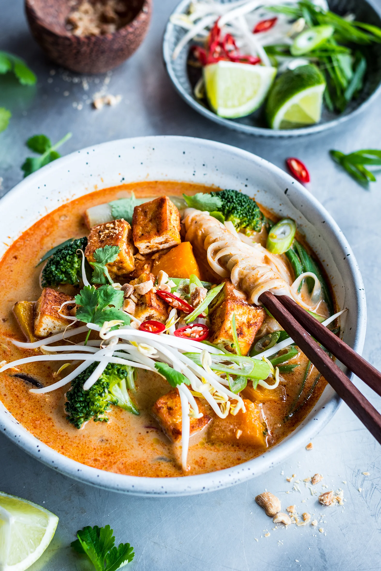 A fragrant red curry and coconut laksa with crispy tofu, pumpkin and greens.