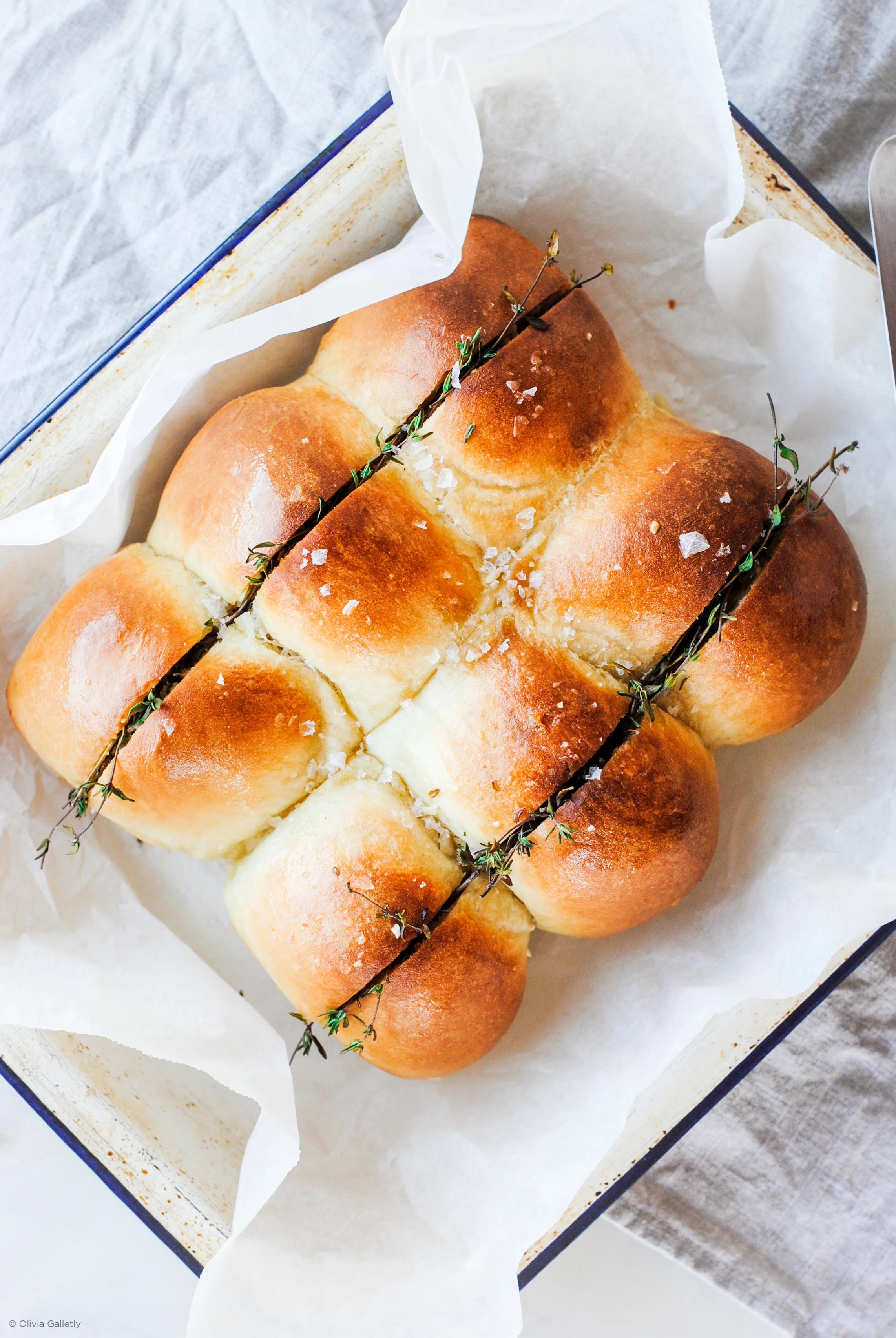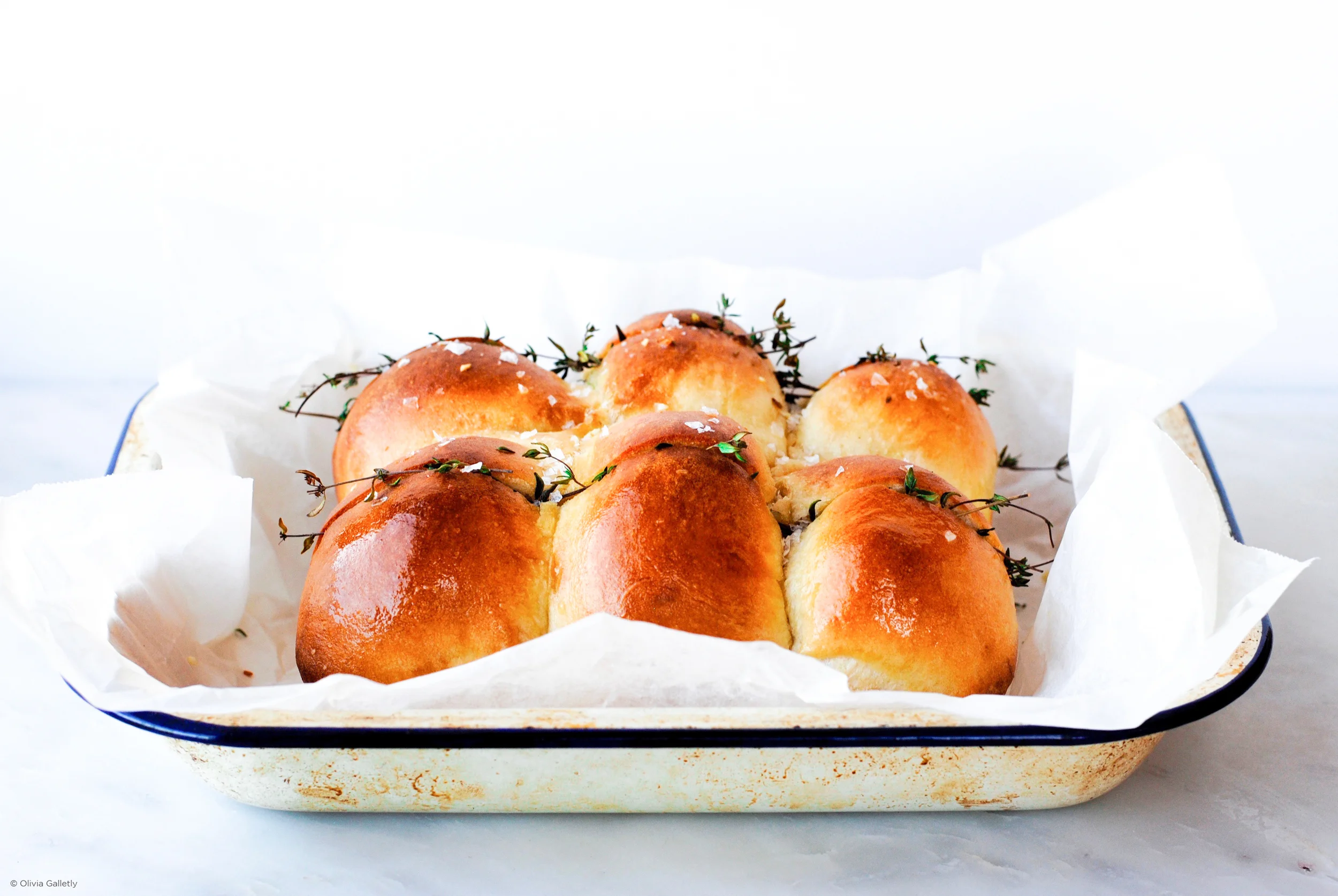 These super soft pillowy rolls are great for entertaining. The creamy garlic butter works fantastically with the zesty fresh thyme. Straight forward and easy to make.