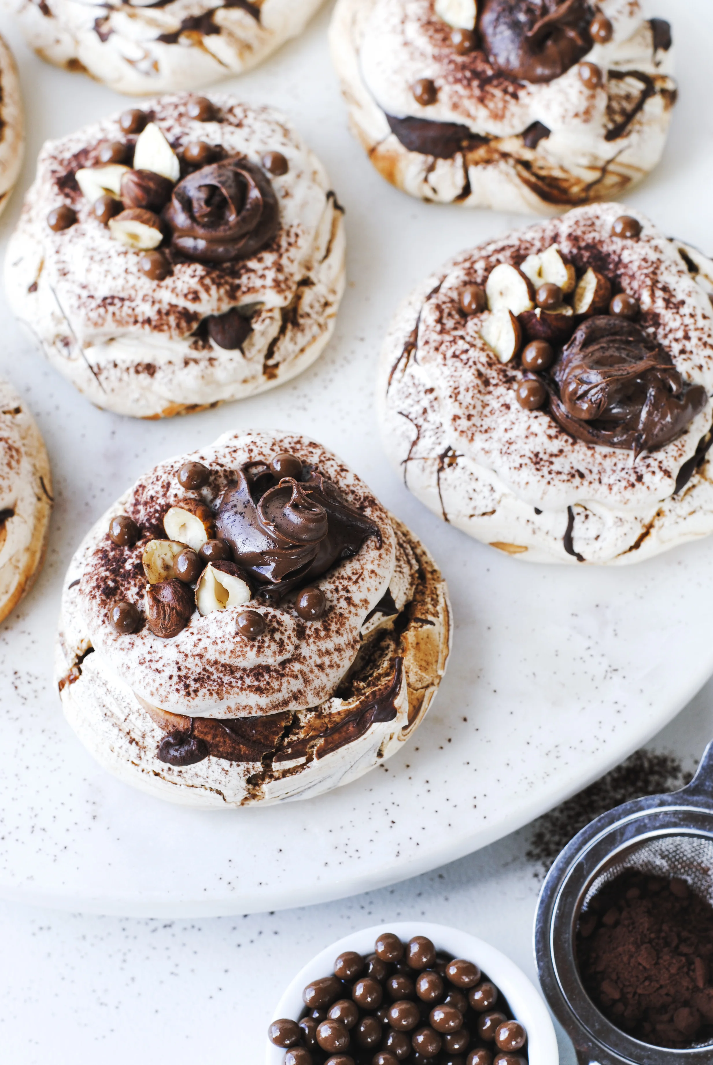 Top meringues with a large spoonful of cream, a dollop of Nutella, hazelnuts, caramel pearls and a dusting of cocoa powder.