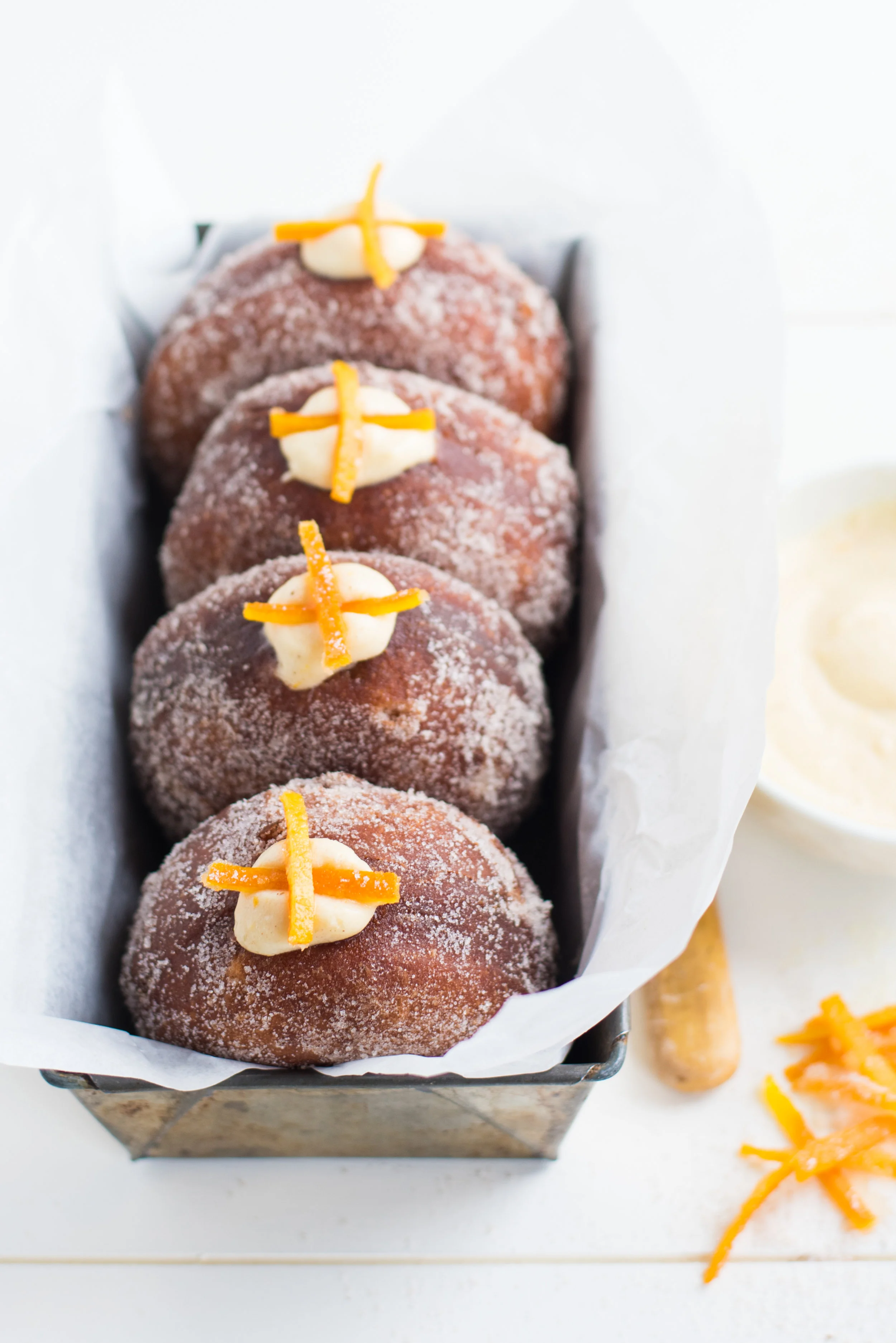 A delicious alternative to the traditional hot cross bun. Fruit brioche doughnuts filled with spiced orange custard, rolled in cinnamon and sugar and finished with a candied orange peel cross.