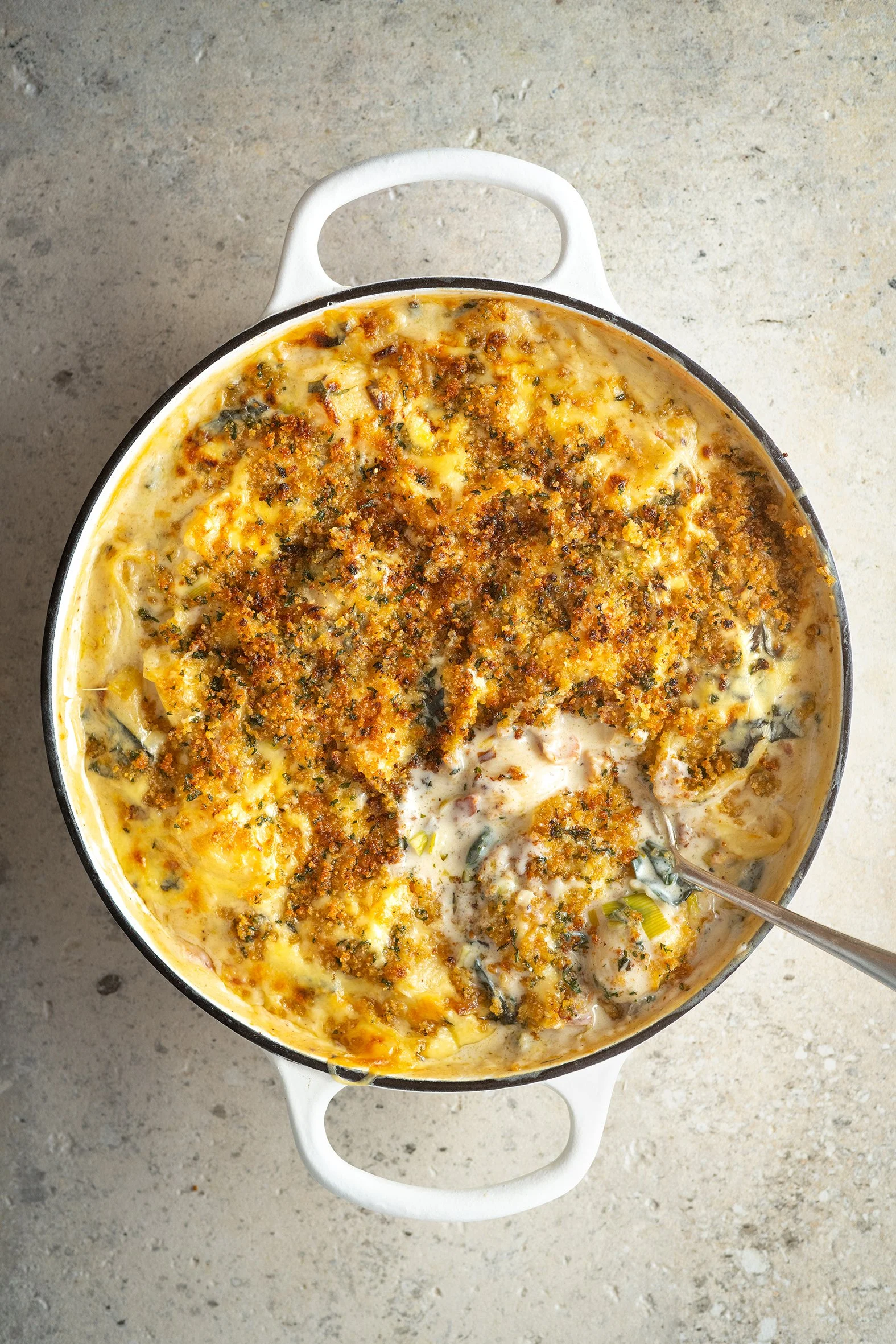 Kinda like mac ‘n’ cheese but with the addition of tender slow cooked leeks, silverbeet and crispy bacon. The cheese sauce is silky and thin which is how I like it, but you can add less milk if you like a thicker sauce. Finished with crunchy parsley breadcrumbs and extra cheese.