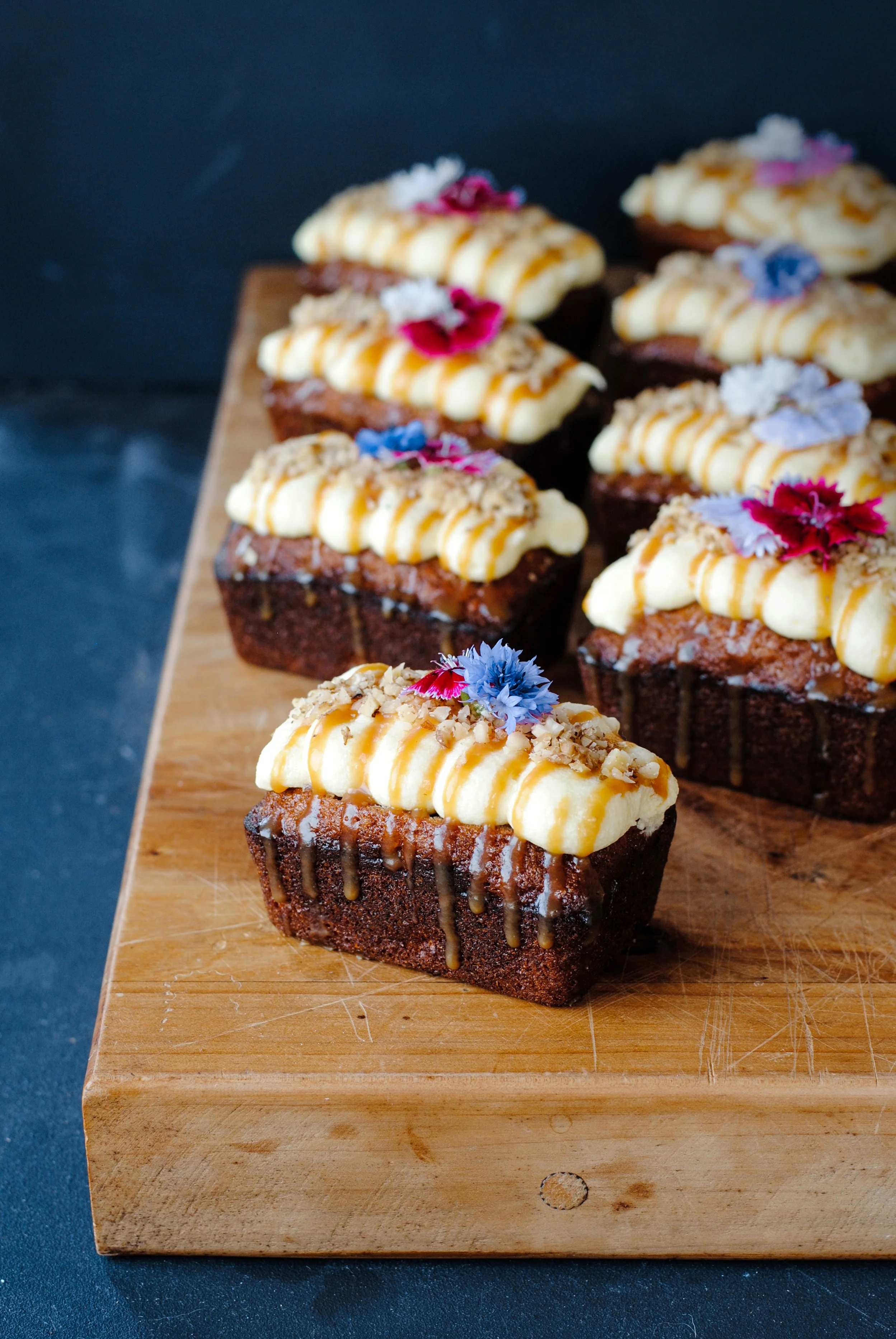 Once loaves have completely cooled pipe over cream cheese icing, drizzle over salted caramel and decorate with finely chopped walnuts and edible flowers.