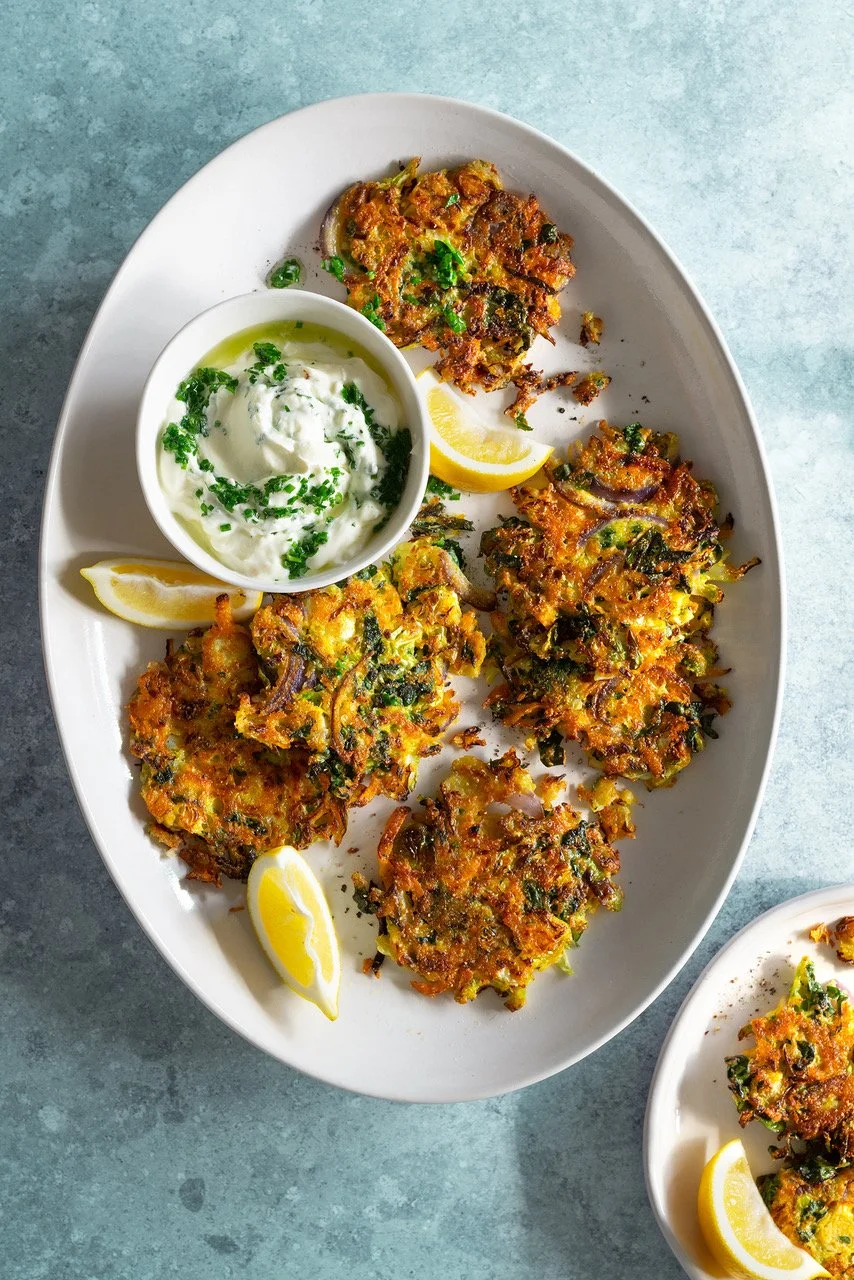Crispy and cheesy vegetable fritters packed with the good stuff. The batter is very thin which keeps them crisp and not at all cake-y. I’ve served them with a little greek yoghurt and a spicy green sauce. Hot sauce, sour cream and mango chutney also work well.