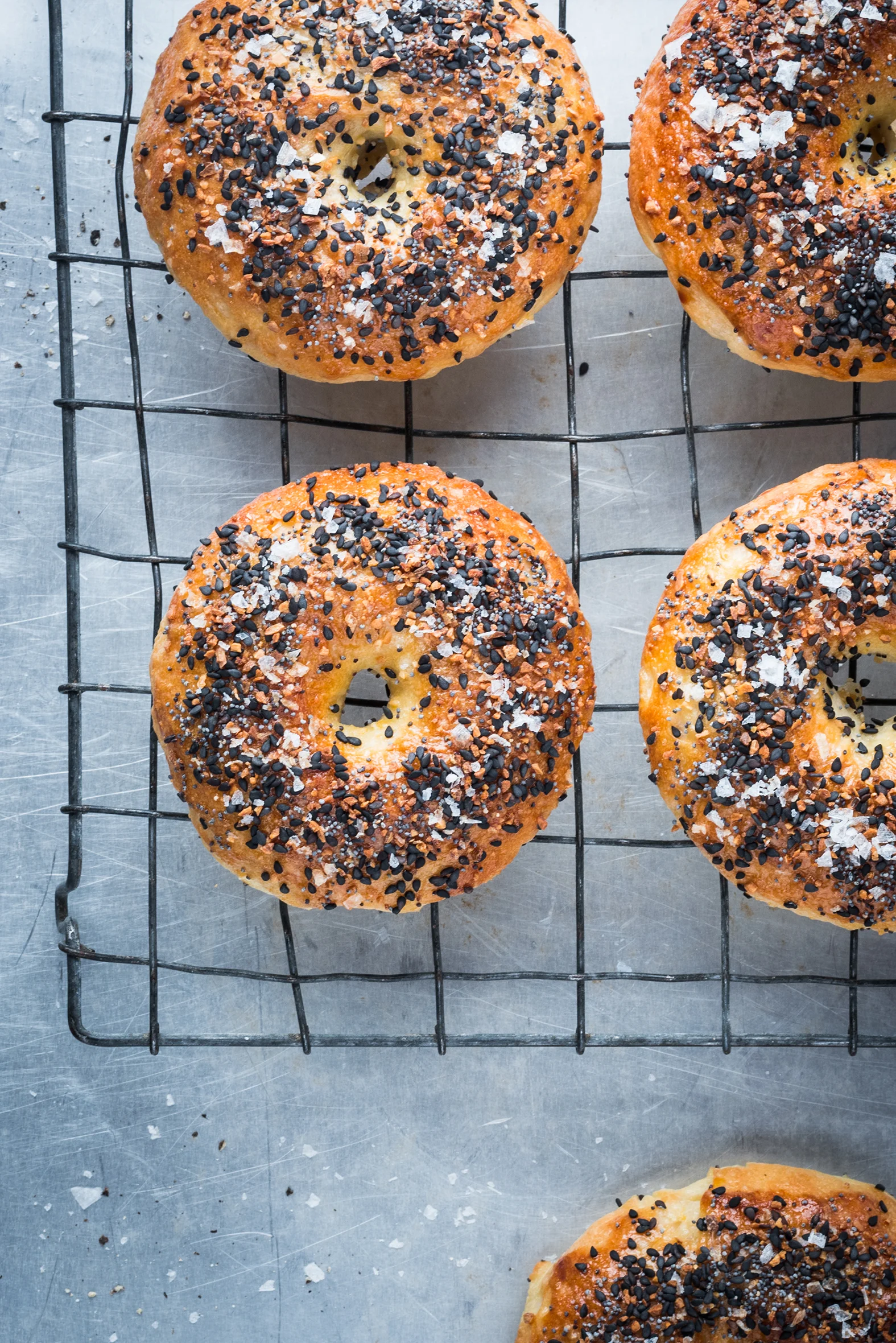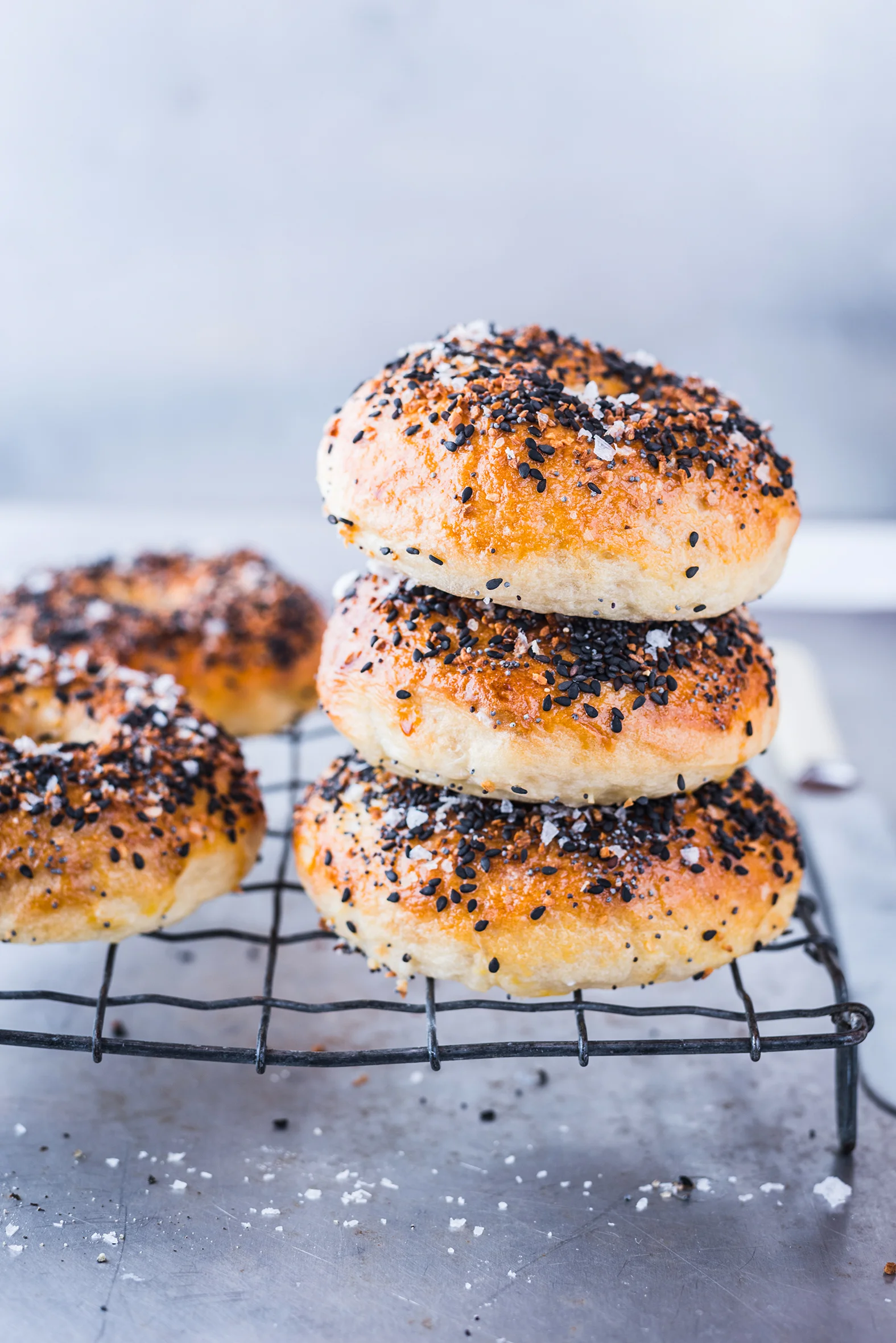 These soft and chewy bagels are so delicious and surprisingly easy. I've topped mine with black sesame seeds, sea salt, garlic chips and poppy seeds. Bagels are best eaten on the day, pop them in the freezer to keep them fresh.